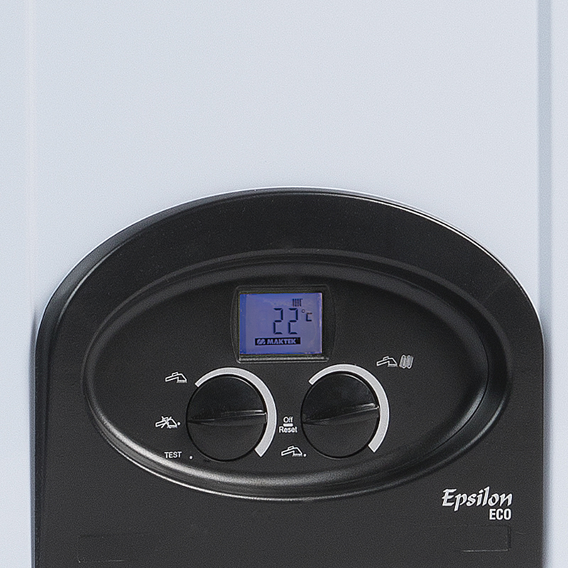 Maktek Epsilon ECO Yoğuşmalı kombinin kolay kullanım paneli ile cihazın ısıtma ve kullanma suyu sıcaklığı ile ilgili tüm ayarları tek bir harekette yapabilirsiniz. Kombi ile ilgili tüm parametre ve bilgilerin alındığı arka aydınlatmalı 2 inçlik LCD ekran, tam kontrol sağlar. Cihazı uzaktan kumanda etmek için aksesuar olarak seçilebilecek kablolu ve kablosuz oda termostatları ile oda sıcaklığına bağlı çalışma, günlük ve haftalık programlama yapılabilir.